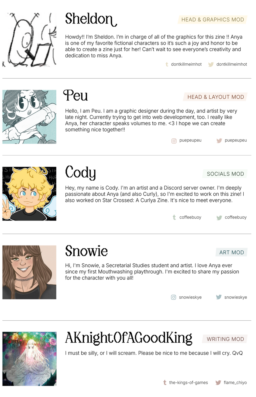 ⮞ Writers: for contributors who will work on a piece of writing for the zine.